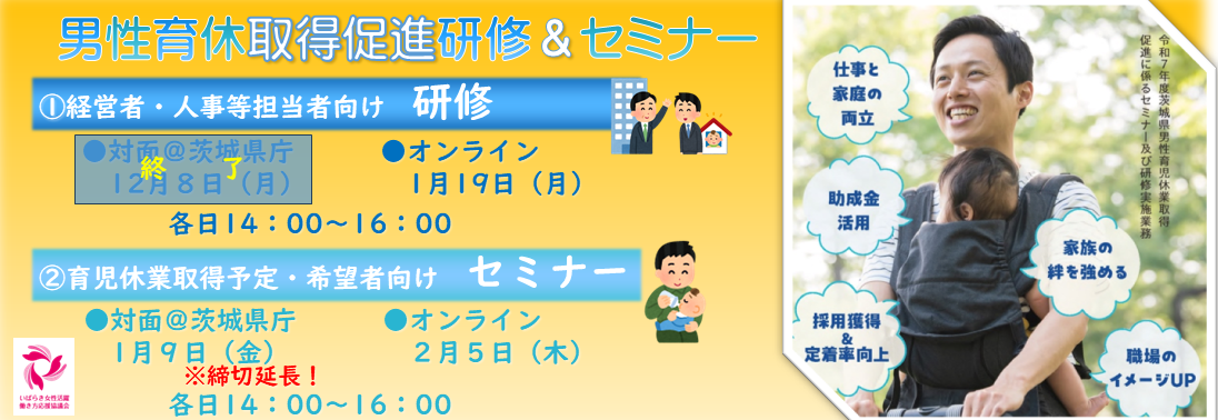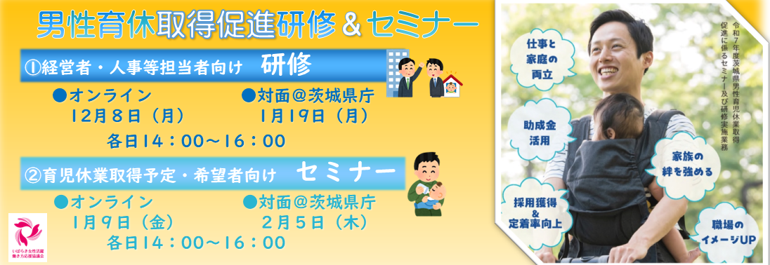 育児・介護休業法により、「産後パパ育休」の創設や育児休業の分割取得が可能となったほか、企業における対象労働者への個別意向確認や育児休業を取得しやすい環境整備が義務化されています。茨城県も加盟している「日本創生のための将来世代応援知事同盟」では、経営者・管理職(イクボス)および育休取得者本人それぞれの視点における男性の育児休業取得のポイントを紹介する動画を作成しましたので、ご紹介します。
